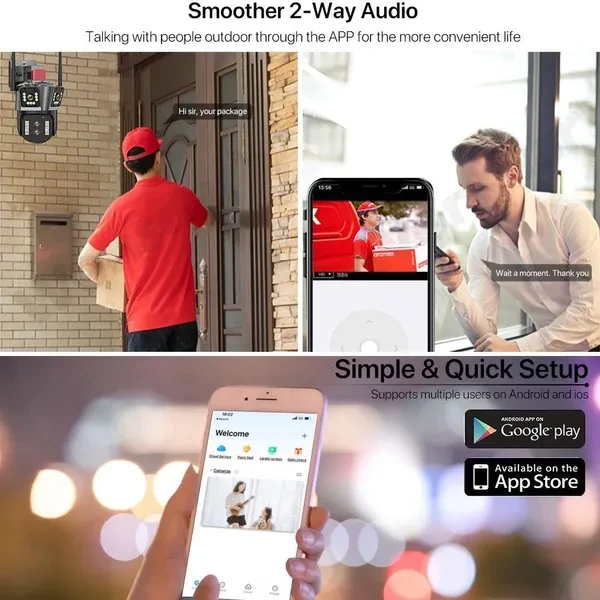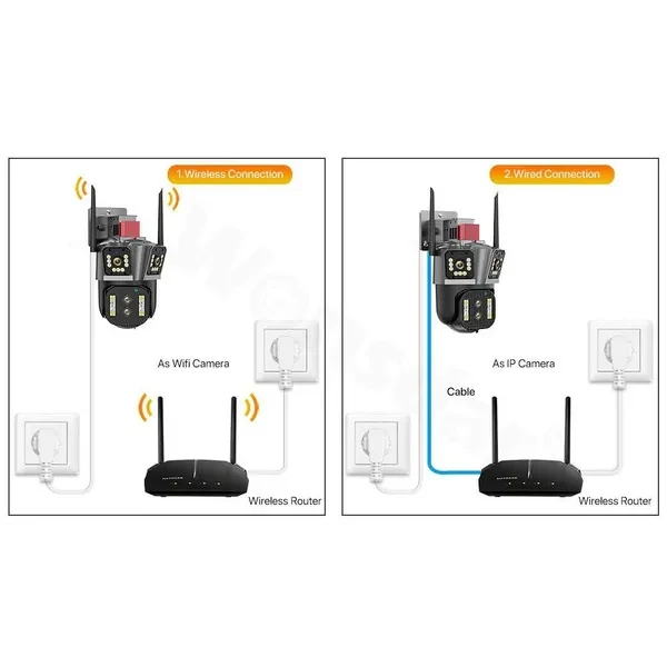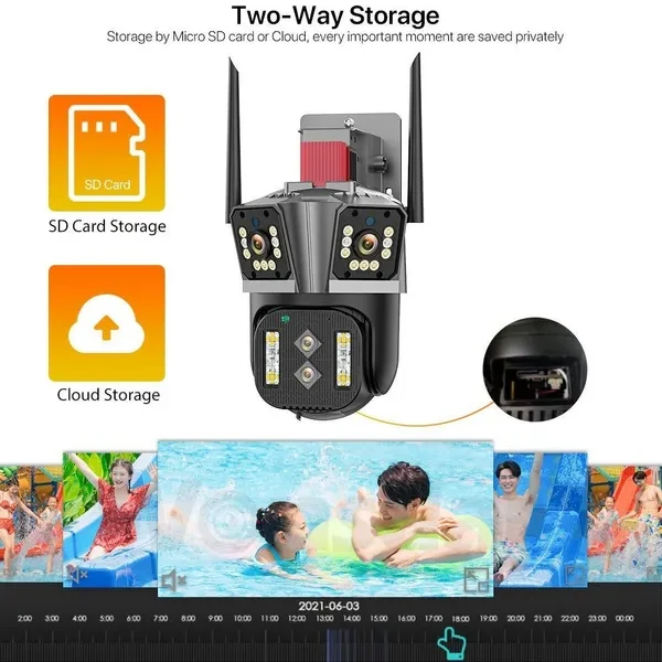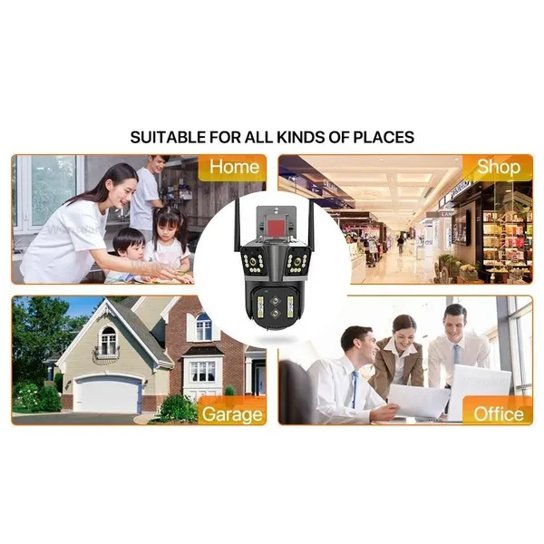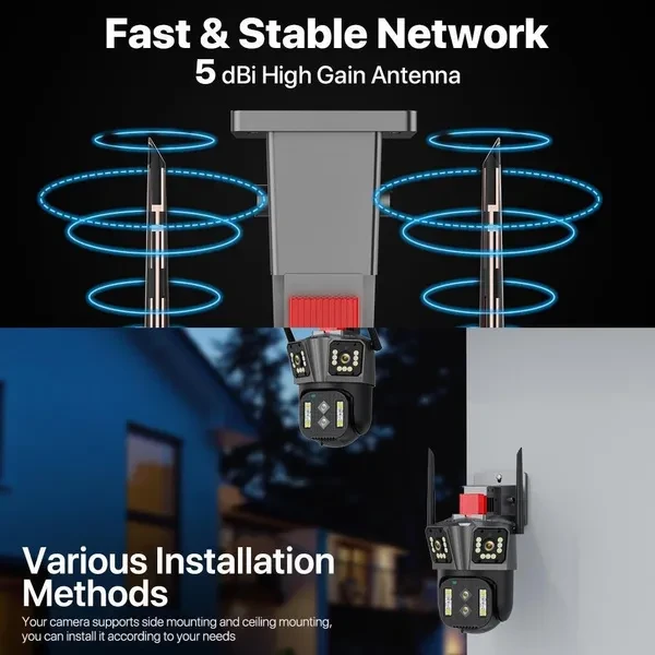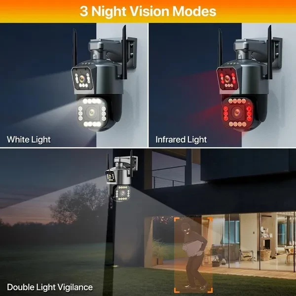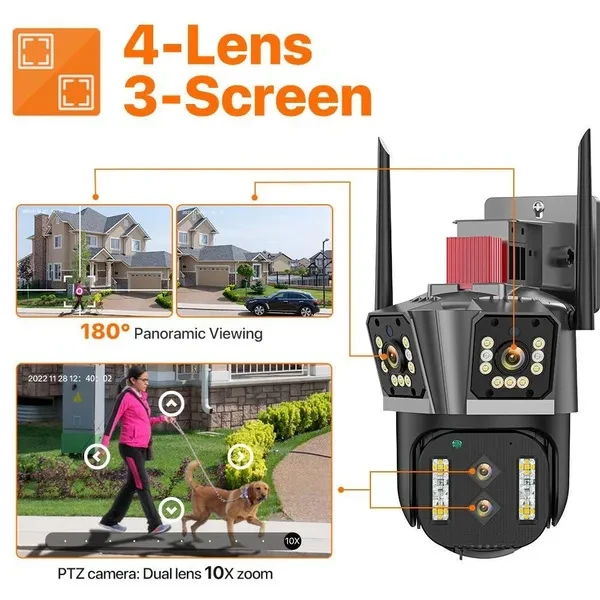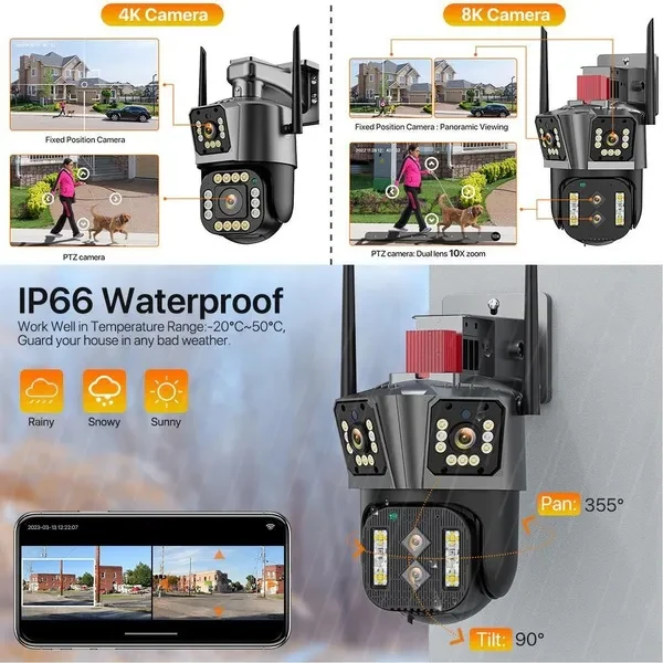 8K HD WIFI IP Camera 10X Hybrid Zoom Auto Tracking PTZ Camera Outdoor Four Lens Three Screen Security Cam 4K Street Surveillance 4K Resolution: Pixels of each lens are 4MP, 4MP Lens + 4MP Lens = 4K 8K Resolution: Pixels of each lens are 4MP, 4MP Lens + 4MP Lens + 4MP Lens + 4MP Lens = 8K Feature - Three lens & Dual sensors & Three screens, you can see more details; - 4K / 8K Two resolution for you to choose. Ultra-high-definition picture, bringing you a more high-definition visual experience 4K Resolution: Pixels of each lens are 4MP, 4MP Lens + 4MP Lens = 4K 8K Resolution: Pixels of each lens are 4MP, 4MP Lens + 4MP Lens + 4MP Lens + 4MP Lens = 8K - 8K camera has Ultra wide angle + 10x zoom, Realizing clear monitoring of far and near; 4K camera not support Zoom - Built-in Infrared LEDs & White LEDs, presenting you with clear and colorful day/night images; - 3 image modes: smart mode/infrared mode/color mode, Infrared mode is infrared on mode. The image is black and white, the white LED is off Color mode: white LED lights up, day and night are color vision; - Support motion detection; Real-time push to protect the safety of your home; - Built-in high-quality speaker and microphone, two-way conversation is barrier-free; - Echo cancellation and noise suppression technology, perfect full-duplex voice effect; - Support 2.4GHz WiFi connection (5G WiFi is not supported); Support RJ-45 network cable connection; - Real-time image transmission, adaptive network;