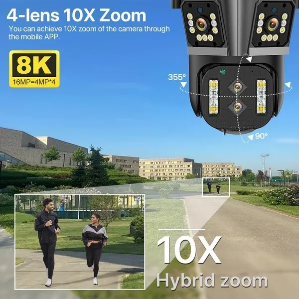 16MP 8K WiFi IP Camera 10X Zoom 4K Outdoor Security Camera Surveillance AI Track Four Lens Three Screen Mini Street Camera 360°+[32G64G TF Card]