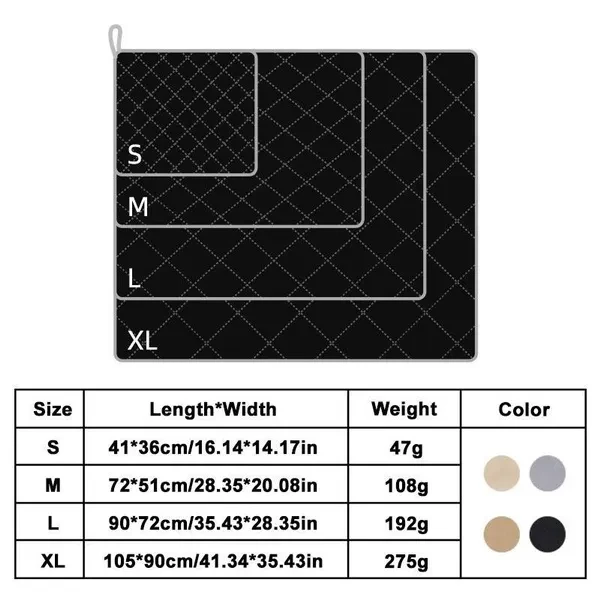 For ease of use it is recommended to purchase at least 2pc Material:Polyester + oxford fabric Color£ºblack/grey/light brown/dark brown Size: S 41x36cm/16.14x14.17in M 72x51cm/28.35x20.08in L 90x72cm/35.43x28.35in XL 105x90cm/41.34x35.43in Package£º1 pc Pet urine pad About this item Composed of four different materials, they are suitable for puppies undergoing potty training and pets suffering from urinary incontinence. Machine washable and reusable, simply wash in the washing machine with warm water and a non-chlorine detergent and use low temperature drying or air dry to regain use. Environmentally friendly and durable, after cleaning can be reused many times, is the best companion for pets, very economical and environmentally friendly, cost-effective far beyond the disposable plastic mats. Absorb water quickly, will quickly absorb moisture in the interior of the pad, and will not leak to the floor, the surface dries quickly, so your pet's environment can always be kept dry. NOTES: Due to different displays and lighting effects, the actual color of the item may be slightly different from the color shown on the picture. Thanks! Due to manual measurement, please allow 1-3cm measurement deviation.