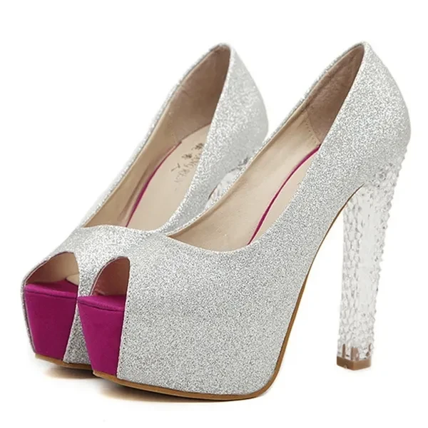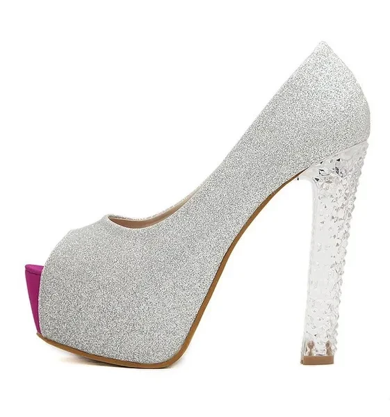 2016 new fashion Classic Fashion High Heels Women Pumps Thick Crystal Heels Sexy Platform Wedding Shoes Open Toes Silver Party Shoes Woman
