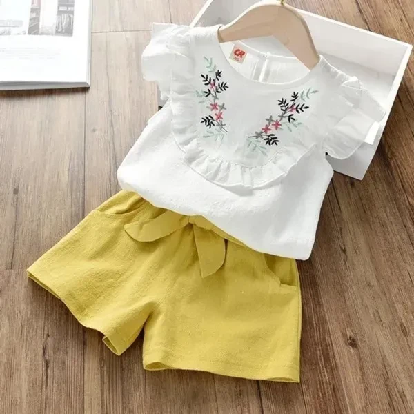 2Pcs Children Clothing Set Little Kids Girls Sleeveless Embroidery Shirt + Bowkont Shorts Baby Girl Outfits