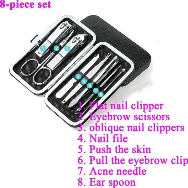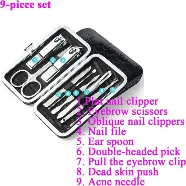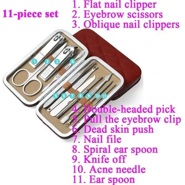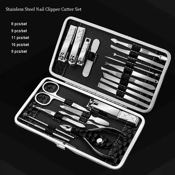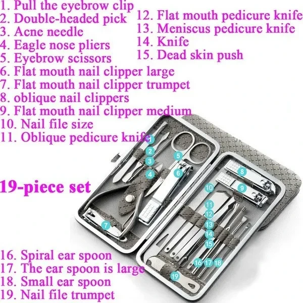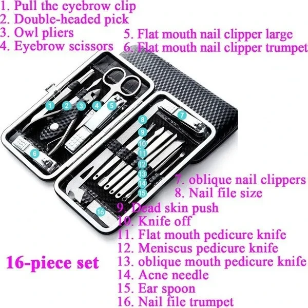 Package:1xTools Set Feature: Material: Stainless Steel Quantity: 4/8/9/11/16/19Pcs Applicable: all people Feature: A care set of three functions must meet what you need,include hand care,facial care,foot care. A new generation of black polishing anti-skid technology,upscale and mysterious,sharpness upgrade again. All the tools are made of top quality black steel,never rusts,extreme hardness. Aesthetic packaging design,the case is made of high quality fabric and PU leather, stylish and elegant,a perfect gift. Perfect combination of exterior and quality. Color:Black/Red/Gray/Blue/Gold Notes: Due to the light and screen setting difference, the item's color may be slightly different from the pictures.Please allow slight dimension difference due to different manual measurement.
