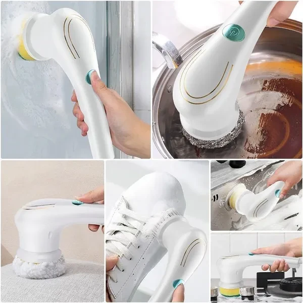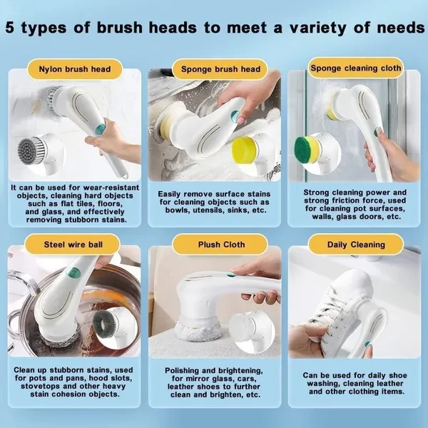 Item Name:Electric Spin Scrubber Battery TYPE :Li-ion Battery Batey Capacity: 500/800/1200 mAh Battery Quantity:1 Battery Voltage:4.2V Waterproof Grade:IPX6 Charging Current: 0.5-1A Charging Interface: USB Charging time:3-5 hour Working time:60-90min Rotating Speed:350 RPM Material:ABS Color: White Size: 28*15.5*10.5cm/11.02*6.1*4.13inch   Package includes: 1X Host 1X Charging Cable 1X Nylon Brush Head 1X Plush Cloth Scouring Head 1X Steel Wire Ball Brush Head 1X Sponge Brush Head 1X Sponge clean cloth  About this item 【Rechargeable & Powerful】 This electric cleaning spin scrubber is equipped with a 500/800/1200 mAh rechargeable battery, and built-in leakage protection technology to not only ensure charging safety but also make it keep working perfectly and continuously for up to 60-90min after fully charged for 3-5 hours. This Electric cleaning brush saves your tired body because of its 350r/min speed, allowing you to clean the stubborn stains more effectively. 【Portable & Cordless】 Getting rid of the long cord, you can easily use this cordless shower brush for cleaning any corner of the house, there will be no more plug and cable trouble. The ergonomic premium silicone grip can be held firmly even with sweaty or wet hands; Super lightweight, even children can easily use it. You will find house-cleaning will be so easy. 【Durable & safe】 This handheld power shower scrubber is made from premium ABS material, it is not only lightweight but also durable. Leakage protection and over-voltage protection ensure the safety of usage, even the children or elderly can use it with no worries anytime anywhere. Meanwhile, this cleaning tool is the best gift for your family and friends. 【5 Kinds of Replaceable Brush Heads】 The electric spin scrubber comes with 5 different kinds of brush heads which are made of premium coarse PC bristles that don't shed easily and prevent scratching up your house. You can use these different brush heads to clean bathroom bathtub, kitchen, grill, stove tops, heavily oiled wall, slot, sink, floor, grout, bathtub, toilet, car wheel, floor, tumblers, windows, dishes, and so on.
