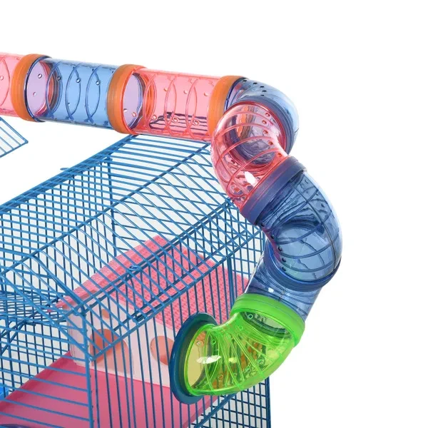 Descriptions Keep your small pets stimulated, safe and happy with a Multi-level indoor small animal cage kit. This animal-friendly design offers multiple platforms for exercise, fun, relaxation, and exploration for small pets like hamsters, mice, gerbils, etc. This hamster cage starter kit includes the main habitat, water bottle, food dishes, and exercise wheels. Play tubing system promotes activity and allows your small pet to move freely. Features - This cage offers multiple platforms for exercise, fun, relaxation, and exploration for your lovely pet. - Includes a small house on the perch, water bottle, food dishes, ladder and exercise wheels - Play tubing system promotes activity and allows your small pet to move freely - The front door allows you access to your hamster easily - Multiple levels design provides plenty of space for activities - The Internal accessories can be placed freely - Simple assembly required Specifications - Color: Blue - Material: Metal, PP, PS - Overall Dimensions: 18.5"L x 11.75"W x 23.25"H - Bottom Tray Size: 18.5"L x 11.75"W x 2.75"H - Door Size: 6" x 5"H - Perch Size (4 perches): 11"L x 6" - House Size: 6.25"L x 3.5"W x 3.5"H - House Door Size: 1.75"L x 2" - Ladder Size: 8.75"L x 2.25" - Exercise Wheels Size: Φ5" x 3.25" - Dishes Size:Φ3.25" x 1.5"H - Water Bottle 80ml - Tube Size: Φ2.25' - Net Weight: 9lbs.