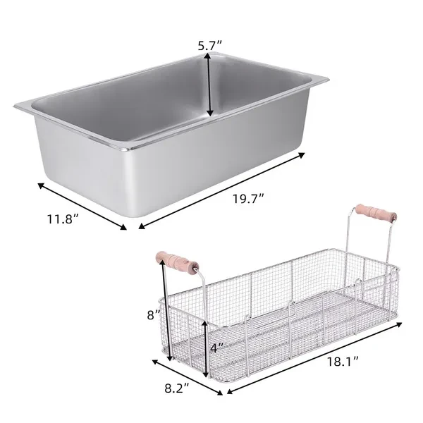 Introductions: This Stainless Steel Deep Fryer is durable for both home and commercial use. Easy to operate and clean. It is great for cooking French Fries, onion rings, egg rolls, fried chicken, shrimp and any other deep fried food. Dual electrical heads and power plugs for single large capacity tank application. In addition, it has a handle on both sides of the fryer basket to prevent scalding hands, safe and convenient operation. Would like to place an order now? Don't hesitate! Features: 1. Heavy duty stainless steel construction for commercial and home use 2. Dual electrical heads and power plugs for single large capacity tank application 3. Thermostats for accurate temperature setting 4. U-shaped stainless steel heating tubes for evenly heat distribution 5. Lid cover prevents the boil oil splashing 6. Fryer basket with handle on each side prevents scalding of your hands and brings safe and easy operation 7. Residue plate for filtering out the dregs 8. 2 hooks on basket for easy hanging up on bar 9. Tank can be detached for easy cleaning 10. 4 feet for good stability on countertop Specifications: 1. Max Power: 5000W (2500W For Each Head) 2. Recommended Capacity: 12.7Qt/12L Tank Capacity: 23.26Qt/22L 3. Voltage: 110V 4. Frequency: 60Hz 5. Temperature Range: 60℃ - 200℃ (140℉ - 392℉) 6. Overall Dimensions: (21.7 x 17.3 x 12.2)" / (55 x 44 x 31)cm(L x W x H) 7. Weight: 39.46lb / 7.9kg Package Includes: 2 x Electric Fryer Head 1 x Oil Pan 1 x Cover 1 x Fried Blue 2 x Slag Board 1 x Mounting Kit (4 Feet 1 x Lid Handle) 1 x Manual