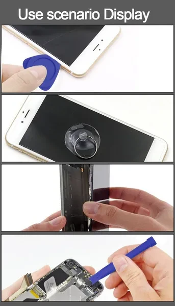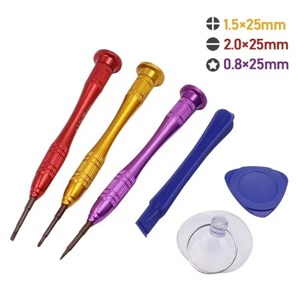 Screwdrivers allow you to open cover of mobile phones easily and without damage to the phone cover. The fancy non-slip stripes process on handle surface and rotary cover make the operation comfortable, improve the work efficiency Material: Chrome Vanadium Alloy Steel Fit for Mobile Phones Weight: 65g Each set include: 1 x 0.8 Pentalobe Screwdriver - iPhone 4 Series, iPhone 5 Series, iPhone 6 Series 1 x 1.5 Phillips Screwdriver - Android Phones 1 x T2 Screw Driver - Huawei MATE, P Series 1 x Suction Vacuum Opener 1 x Blue Plastic Pry Tool 1 x Blue Pick