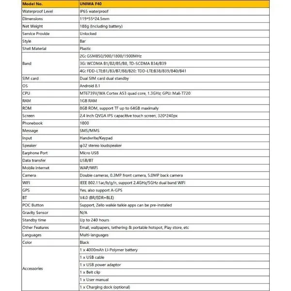 4G version. Long antenna version/Short antenna version Alps F25 2.4-inch touch screen, 4G Android smartphone Android intercom with ZELLO, PTT network intercom 1) 4G signal is enhanced through an external antenna 2) Mtk6735 quad core 3) Zello Walkie Talkie 4) Front and rear dual cameras 5) GPS navigation 6) 3500mah large battery with ultra long standby time 7) Global 4G 8) Double card and double standby Intelligent intercom terminal device with 2.4-inch touch screen and 4G buttons, Android smartphone with ZELLO PTT network and software intercom function, support for downloading apps, black screen intercom, memory 1+8GB quadcore processor core, front and rear dual cameras supporting law enforcement recording, adding memory card to expand memory, supporting the use of third-party APP software or network intercom applications such as Taotao and Weila, and unlimited intercom distance, universal, let it go Network format: GSM, CDMA, 3G (WCDMA), 4G (TD LTE) Processor core: quad core Color: Black European version, Black American version Model: ALPS F25 Running memory: 1GB Appearance: straight plate Main screen size: Small screen (below 4.0 inches) CPU brand: MediaTek Brand: UNIWA Article number: F25 3C Certificate No.: 2021161606612142 Body memory: 1G+8GB standard version Battery capacity: 3000mAh -3999mAh Network mode: dual card dual mode Memory card: supports memory cards Mobile version: Hong Kong, Macao and Taiwan version Telecommunication equipment network access license number: 02-B432-214122 Operating system: ANDROID Camera pixels: 8-11.99 million Main sales regions: Africa, Europe, South America, Southeast Asia, North America, Northeast Asia, Middle East Phone type: Professional Android intercom phone 4G; Model No. Alps F40 Waterproof Level IP65 Dimensions 119*55*24.5mm Net Weight 188g (Including battery) Service Provide Unlocked Style Bar Shell Material Plastic Band 2G: GSM850/900/1800/1900MHz; 3G: WCDMA B1/B2/B5/B8, TD-SCDMA B34/B39 4G: FDD-LTE:B1/B3/B4/B7/B8/B20; TDD-LTE:B38/B39/B40/B41 SIM card Dual SIM card dual standby OS Android 6.0 Marshmallow CPU MTK6737M Cortex A53 quad core, 1.1GHz; GPU: Mali-T720 RAM 1GB RAM ROM 8GB ROM, support TF up to 32GB maximally Screen 2.4 inch QVGA IPS capacitive touch screen, 320*240px Phonebook 1000 Message SMS/MMS Input Handwrite/Keypad Speaker φ32 loudspeaker Earphone Port 3.5mm  Data transfer USB/Bluetooth Mobile internet WAP/WiFi Camera Double cameras, 0.3MP front camera, 5.0MP back camera FM Radio Yes, earphone needed WiFi Yes, IEEE802.11b/g/n GPS Yes, also support A-GPS BT Yes, V4.0 (BR/EDR+BLE) POC Button Yes, Zello walkie talkie apps can be pre-installed Gravity Sensor N/A Standby time Up to 240 hours Other Features Email, wallpapers, tethering & portable hotspot, play store, etc Languages English, Bahasa Indonesia, Bahasa Melayu, Cestina, Dansk, Deutsch, Eesti, Espanol, Filipino, French, Hrvatski, Isizulu, Kiswahili, Italiano, Latviesu, Lietuviu, Magyar, Nederlands, Norsk, Polish, Portuguese, Romana, Rumantsch, Slovencina, Slovenscina, Suomi, Svenska, Vietnamese, Turkish, Greek, Bulgarian, Russian, Ukrainian, Urdu, Hebrew, Arabic, Persian, Thai, Khmer, Hindi, Japanese, Korean, Simplified/Traditional Chinese Color Black Accessories 1 x 4000mAh Li-Polymer battery 1 x USB cable 1 x USB power adaptor 1 x Belt chip 1 x User manual