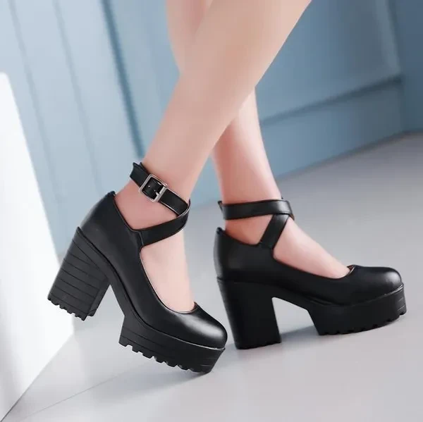 Autumn Vintage Womens Chunky Block High Heel Platform Ankle Strap Buckle Pumps Punk Shoes Plus Size Black White