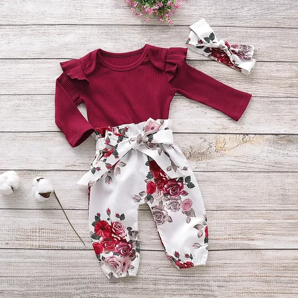 Baby Girls Pit Romper Flower Pant Headband Suit Toddler Long Sleeve Bodysuit Trousers Bow Set Outfits Clothes 3Pcs