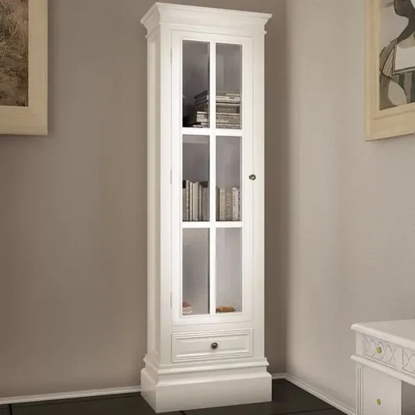 This tall spice Cabinet has three display shelves and 1 bottom drawer. It has a glass door for the display shelves to keep away dirts and dusts. It is a great organizer in the office, living room, bedroom, or any other room in the house.The Cabinet is made of durable, light weight MDF, painted in white and distressed for a primitive, vintage, aged appearance. Its versatile and stylish design make it a great fixture in your home. Note: since this furniture is hand-crafted, made of wood and painted white, it may come with a small defect. Material: MDF, glass Colour: white Dimensions: 41 x 26 x 147 cm (L x W x H) WARNING: In order to prevent overturning, this product must be used with the wall attachment device provided