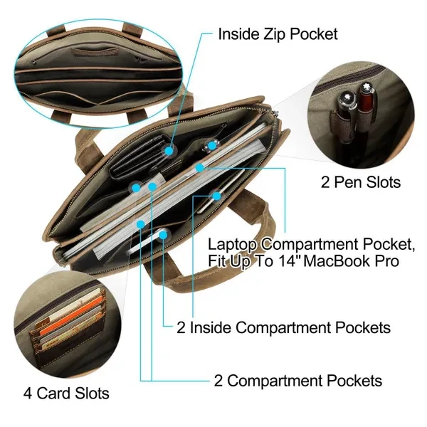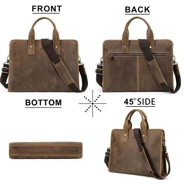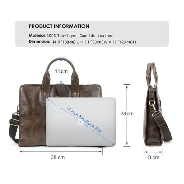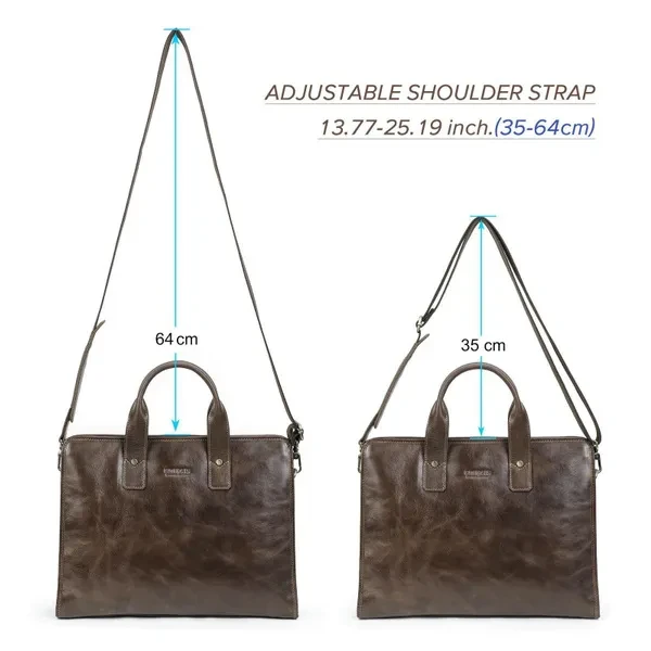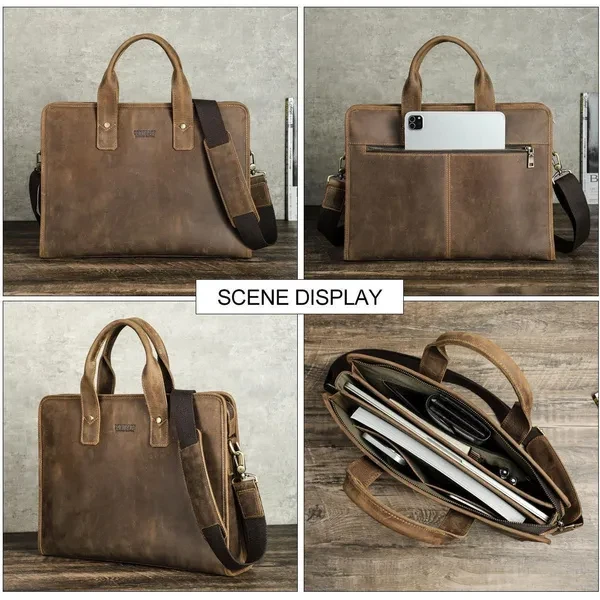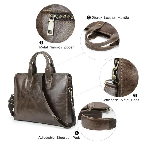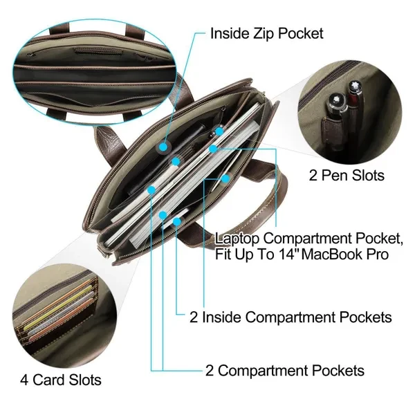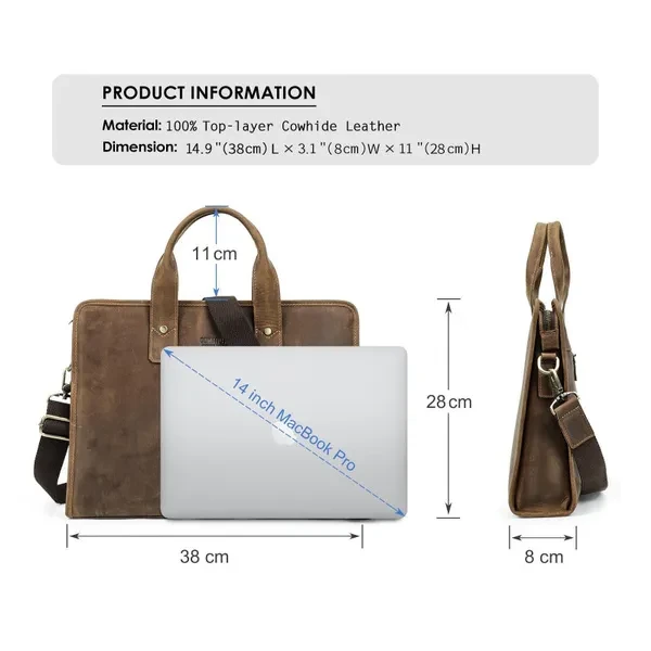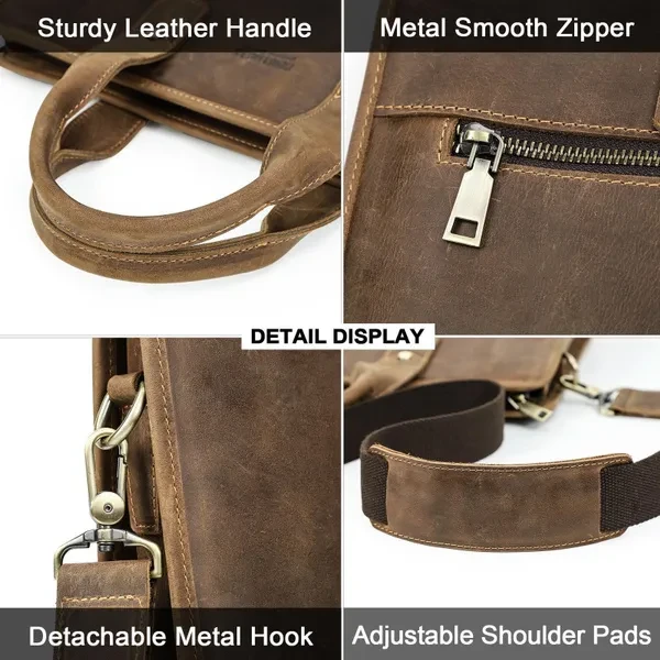 ● Brand Name: Contact'S ● Main Material: Genuine Leather ● Genuine Leather Type: Cow Leather ● Lining Material: Polyester ● Origin: Mainland China ● CN: Guangdong ● Place Of Origin: China (Mainland) ● Material Composition: vegetable tanned leather,crazy horse leather ● Closure Type: zipper ● Item Height: 28cm ● Item Width: 8cm ● Item Length: 38cm ● Item Weight: 1.13kg ● Gender: MEN ● Number of Handles/Straps: Single ● Style: vintage ● Pattern Type: Solid ● Model Number: MB242 ● Interior: Interior Slot Pocket,Cell Phone Pocket,Interior Zipper Pocket,Interior Compartment,Computer Interlayer ● Handle/Strap Type: Soft Handle ● Exterior: Open Pocket ● Size: 14 inches ● Color: Coffee Feature: 1.Durable genuine leather quality - The coffee bag made of crazy horse genuine leather ,the DARK coffee one made of quality vegetable tanned leather; and the lining is polyester. 2.Roomy capacity - Fits for 14 inches macbook pro. 3.Widely usage & Generous man design - A quality and popular design bag for men, it is ideal for daily,school, dating, shopping and travel using. A practical gift for boyfriend, husband, fathers and sons.EU Representative Info: