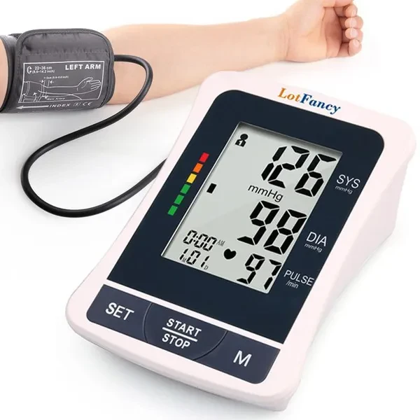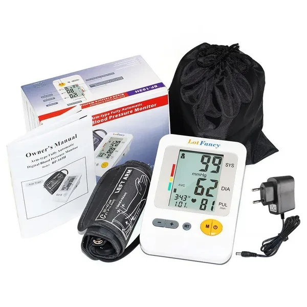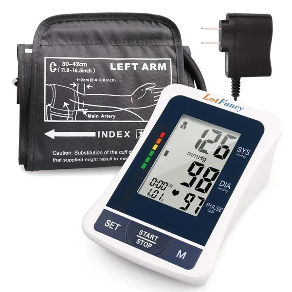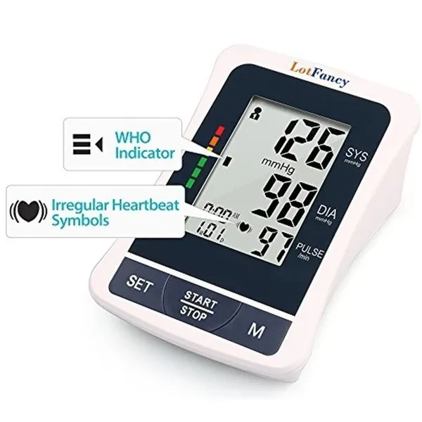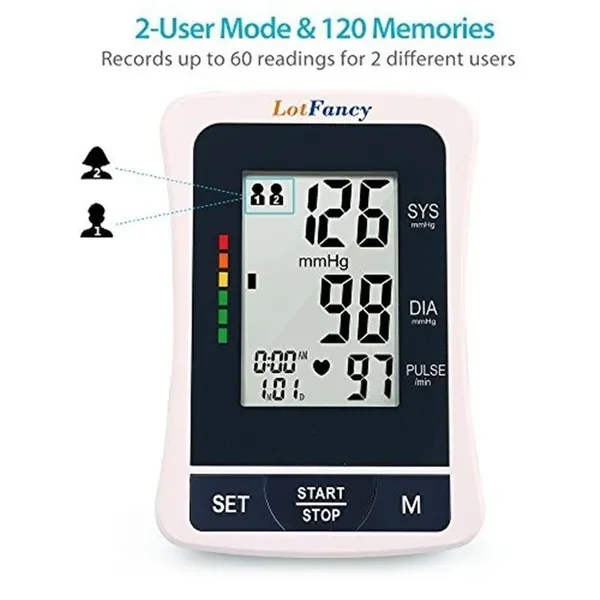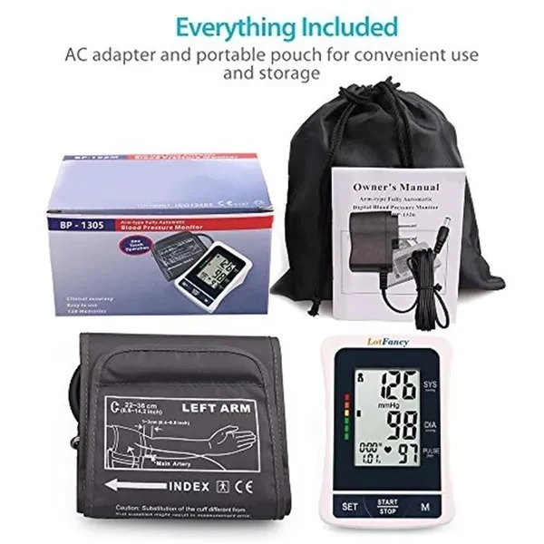 Product Description: Black color: Features: Easy to use, with automatic inflation and reading of blood pressure and heart rate Easy-to-read big 4 inches LCD display 3.31 x2.17 inches Irregular heart beat detection ,60x2 memories for 2 users ,last 3 results average WHO blood pressure classification indicator ,low battery indicator , auto shut off function conserve your battery life Important Note: -Be sure to order the correct size for your upper arm measurement. -Apply cuff as illustrated in the manual and tighten firmly before starting the reading. -Take blood pressure at the same time every day. In the morning shortly after getting up is best. -Avoid eating, alcohol, smoking, exercising, medications, and bathing for 30 minutes before measuring blood pressure. -Rest in a chair for 5 to 10 minutes before taking a reading. -Sit in a comfortable position and rest your arm on a table at approximately heart level for the reading. -Note that your blood pressure can vary significantly in as little as a few minutes. -For maximum accuracy you can use the option to average your last 3 readings. Specification: Measurement Range :Pressure: 0mmHg-300mmHg ,Pulse: 30-180 Beats/Minute Measurement Accuracy :Pressure:±3 mmHg , Pulse:±5% Pressurization :Automatic Pressurization Memory :120 memories in two groups with Date and Time Unit Weight :Approx. 10.72oz(Excluding Batteries) Unit Dimensions :6.54x4.49x2.83 Inches Package Includes 1 x Blood pressure monitor 1 x Cuff;(fits arms 8.6 to 14 inches in circumference), 1 x User Manual Note:Requires 4 AA batteries (not included) ::::::::::::::::::::::::::::::::::::::::::::::::::::::::::::::::::::::::::::::::::::::::::::::::::::::::::::::::::::::::::::::::::::::::::::::::::::::::::::: White color: Features: * Accurate & Reliable: LotFancy blood pressure monitors are the most cost-effective and the most user-friendly brand for clinically-accurate home blood pressure monitoring * 4 Users* 120 Memory: Large storage support up to 4 users to store and review last 30 readings each (total 120 reading memory with date and time stamps) - Perfect for a family of 4 with history of high blood pressure and heart disease * Fast Reading & Large Display: Automatically displays the average of your last 3 readings recorded on large LCD screen, and colored buttons ensure that it is elderly friendly. Easy memory settings make it hassle free for everyone in the family. * BP Monitor for Home Use: Irregular heartbeat detector notifies you if an irregular heartbeat is detected while monitoring * Package Includes: 1x blood pressure monitor, 1x large D-Ring cuff (fits arms 8.6 to 14 inches in circumference), 1x power adapter, 1x instruction manual and 1x carrying pouch, Our Upper Arm BP Monitor comes with storage bag, to keep your bp device clean and dust free. Perfect size for your luggage, bring it anywhere, anytime