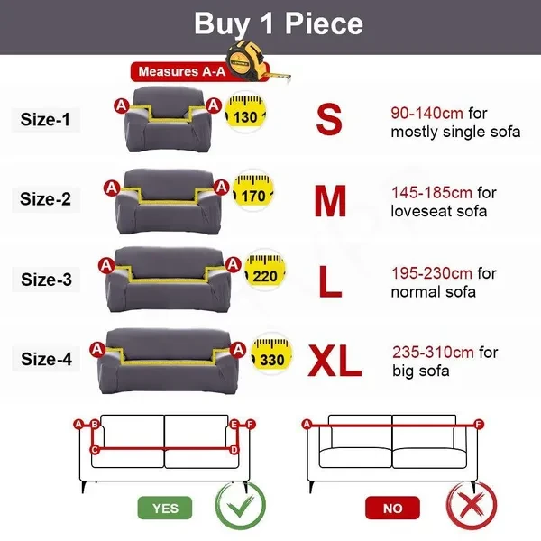 Please Note: ★★★Product Sell Quantity:1PC 1. We sell sofa covers in 4 sizes. There will be size differences in different countries, please refer to the size guide before buying! Must purchase the correct size to use. If you do not understand, please contact us, we will reply you within 48 hours, if your purchase is wrong, we will not refund. 2. Each part of the sofa needs a cover. Please confirm the quantity when buying. For example, the L-shaped chaise longue has 2 parts. You need to measure the correct size to buy 2 pieces. Please do not buy only one piece. Our sizes are all individual units, thank you! 3.L shape sofa need buy 2pcs Size Guide: ①For 1/2/3/4 seater sofa: Please measuring length of AA( included the armrest),need buy 1pc if Size=90-140cm , buy 1-seater if Size=145-185cm,buy 2-seater if Size=190-230cm,buy 3-seater if Size=235-300cm,buy 4-seater ②For L shape sofa: Please measuring length of AA,BB(included the armrest),need buy 2pcs If size A-B =90cm, size C-D=145cm. You need buy 3 seater sofa + 4 seater sofa = 2pc 3.sectional sofa: Please measuring length of AA,BB,CC (include the armrest),need buy 3pcs If AA=185cm, BB=230cm,CC=300cm. You need buy 3 seater sofa + 4 seater sofa + 2 seater sofa. Package includes of 1PC sofa cover,plz choose correctly quantity for your sofa shape!