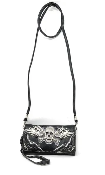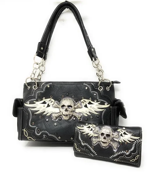 Texas West Women's Embroidered Metal Skull With Wing Purse Handbag and Wallet set Premium Concealed carry purse. Concealed carry pocket: 9" x 6", fits most guns and pistols. Size: Handbag 13" x 8" x 5". Wallet: 7.5" x 4.5" x 1". Handbag with 2 compartments inside. Zip closure on top and inside. 2 side pockets with button closure on the side. Extra pocket on the back is for everything easy to get, like keychains, phones. Same business day handling with fast shipping.