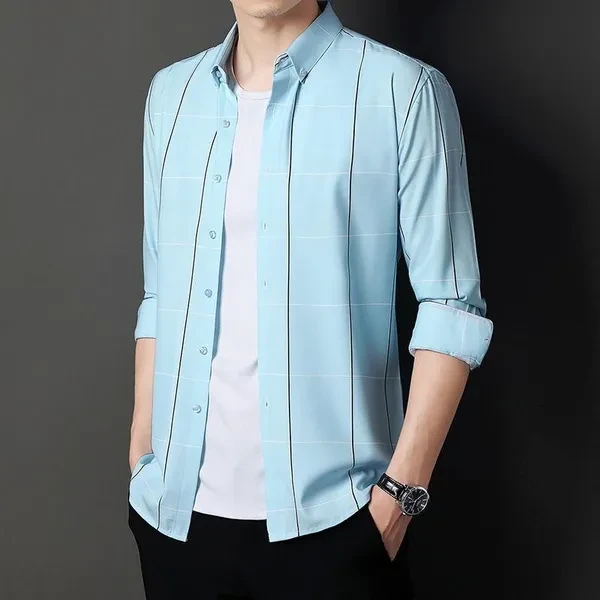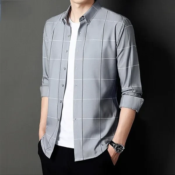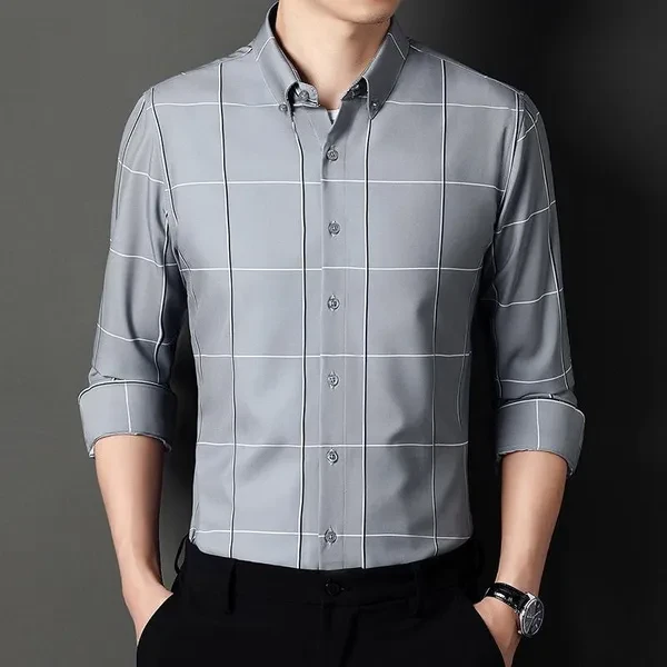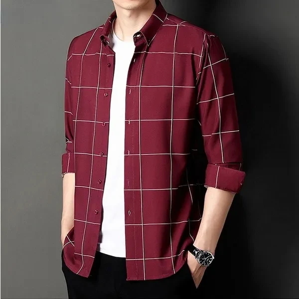 Fashion Men Plaid Shirts Pure Color Cotton Business Long Sleeved Shirts 5 Colors