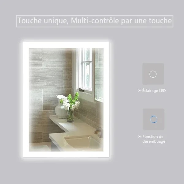 These upgraded wall mounted lighted vanity mirror has got an unique defogger button, which will be effective few seconds after turning on. The built in anti-fogging function means no need to constantly treat your mirrors with fog free spray, or rinse them multiple times per shower. Besides, you can also turn it off as it is not needed, as there are the mirror with demist function, but it was always heating as long as the power is on, which is not that convenient as sometimes you are not needed it. Specifications: 1. 4mm environmental protection copper-free mercury mirror 2. Aluminum alloy frame + matte, width 40MM, without acrylic, 3. Color temperature: 6400K +/- 300k 4. Single touch switch (located in the lower right corner, can be hung horizontally and vertically) + anti-fog function 5.2835 LED light strip 5. Size:50*70cm/60*80cm/70*90cm Package Included: 1 x LED Light Mirror 1 x Accessory