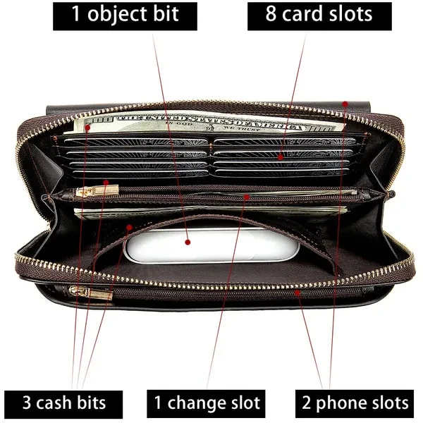 Genuine Leather,Antimagnetic lining,Zipper closure. High Quality: Genuine Leather Crafted , Zipper runs smoothly, rugged construction will last for years and years. Length: 4.72", Width: 0.98", Height: 8.66" (Length: 12cm, Width: 2.5cm, Height: 22cm). Well Constructed: 1 zippered main compartment with 8 card slots and 3 cash bags,2 cell phone pockets,1 change slot,1 zippered back pocket,Keep your things organized in your bag. IP AROUND DESIGN KEEP SAFETY: Zip around design is protect our credit card and cash from missing and prevent our credit card privacy Information leakage. Simple & Fashion & Business: zipper long wallet card case suit perfect for all occasion, business, casual, daily. Just take it, always delighting you. Whatever the fashion style change, our quality and the workmanship will keep the best all the time. One with you!