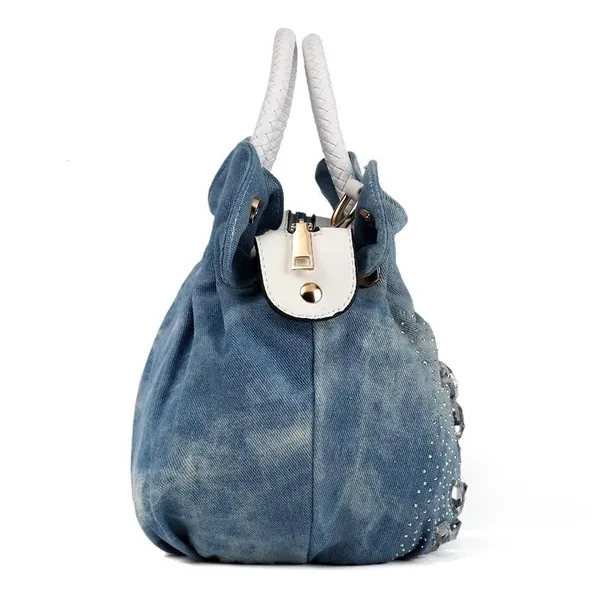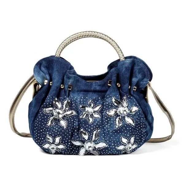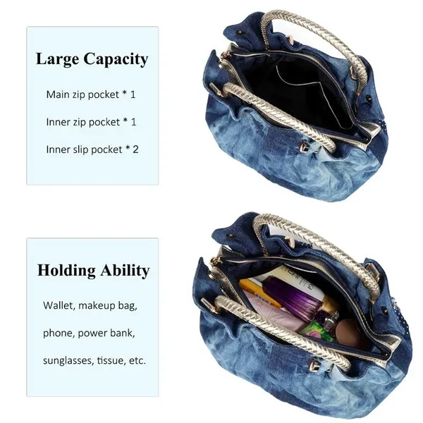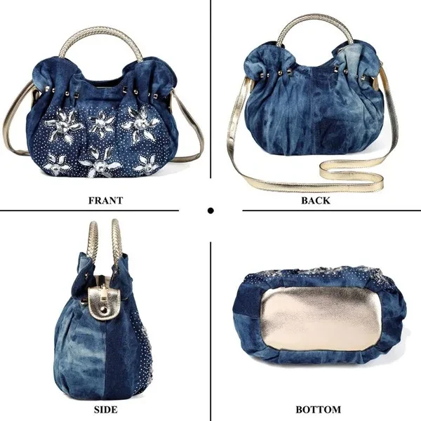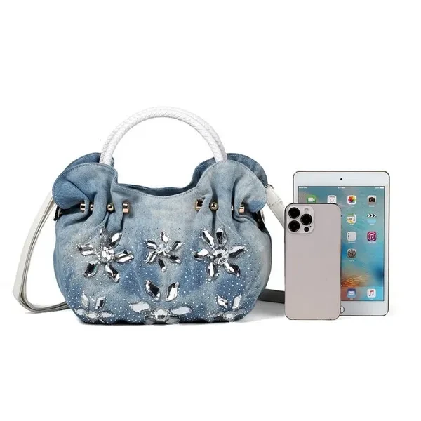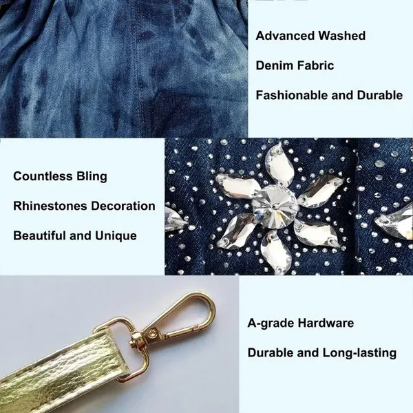 ?【Material】: High quality washed denim, comfortable, washable, ironable, soft handle feel and durable, pure handmade inlaid with crystal diamonds and countless spking bling rhinestones make the bag more fashionable and beatiful. ?【Dimension】: 8(W) * 4.5(D) * 12.5(H) inches, Handle height: 4.5 Inches(use for hand-carry), detachable strap length 53 inches(long enough for crossbody bag), good for everyday use, holds your daily essentials such as collapsible, mobile phone, cosmetics, wallet and more. ?【Weight】: 1.34 pounds/0.61 KG. It easily goes with any outfits, ranging from skirts to jeans. Fashion and casual, all you dream of are displayed by one single shoulder handbag. It's a must have for women in this season. ?【Functional Structure】: Unique shape, compact design, roomy main body design can put power bank, tissue and other daily items; Multi inside pockets is convenient for storing your cosmetics, keys, and other small items. ?【Multifunctional use】: Perfect for daily use - party, traveling, work or shopping, etc. What's more, the length of the shoulder strap is adjustable and removable, so it can work as handbag, cross body bag and shoulder bag.