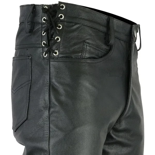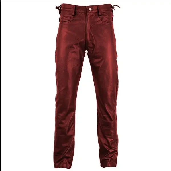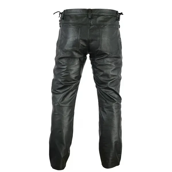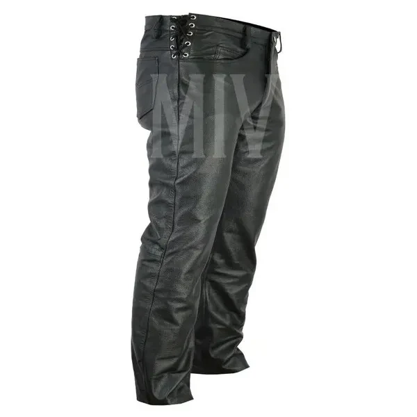 Men's black Thick Leather Side Laces up Jeans Style long Pant Motorcycle Leather Trousers