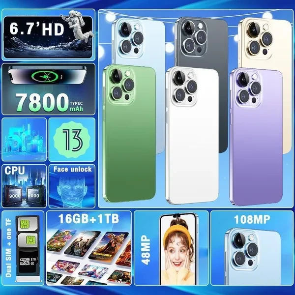 features -6.7 inch full screen i15 pro max provides the viewing experience you have always wanted. 7.3 screen to body ratio 93% -48MP front camera clear and fashionable self-portrait The world's leading 48MP front-facing camera of i15 pro max turns every selfie into a work of art. Whenever you are in the darkest light, you can experience higher brightness, color vitality, clarity and dynamic range. i15 pro max is right beside you, capturing every moment with crystal precision, turning your photos into masterpieces and shining in every photo -64MP rear HD camera The camera combination of i15 pro max is 48 million+64 million pixels. The main camera uses f/2.0 aperture and f/1.8 aperture to focus automatically. This powerful combination enhances the sensitivity under backlight or weak light. Just aim and shoot, i15 pro max will ensure that your photos remain clear and bright -Facial channel i15 pro max also supports face recognition. After activation, i15 pro max will scan your facial features and unlock them immediately. Using mobile phones has never been so simple and interesting -Powerful performance Qualcomm 888 10-core mobile platform uses 10mm technology to make young people fall in love with young people and other popular games -Android 13 New interactive design, simple and clear operation, simple and clear use of mobile phone, everything is very convenient -Dual SIM cards support TF cards Double card and double standby. The card slot does not distinguish between primary and secondary cards. It supports the networks of 50 major communication operators in the world Specifications 1. Model i15 pro max 2. Platform Qualcomm 888 10core 3. Standby dual sim dual standby (dual sim+dedicated micro SD card slot) 4. Screen 6.7 HD full-screen 2280 * 3200 5. Speaker 1511 box speaker 6. Frequency GSM5018001900MHz, 3WCDMA85019002100MHz, 4G LTE 5G 7. Vibration support 8. Color: black, white, gold, purple 9. Memory 16GB RAM+1TB ROM 10. Multimedia MP3MP43GPFM wireless Bluetooth 11. Camera 48MP+64MP 12. Multi-functional full-screen, face recognition, dual SIM card, Wifi, GPS, gravity sensor, alarm clock, calendar, calculator, recorder, video recorder, WAPMMSGPR, image viewer, e-book, world clock, task card, flash back IML back cover 13. Multi-language support 14. Other Android 13 systems 15. Battery 6800Mah lithium-ion battery look out Due to the difference in light, the actual color of the phone may be slightly different from the screen and pictures. The color name is only used to distinguish a single SKU. Please understand this. Thank you. Battery capacity is typical data of factory laboratory. The specific charging speed, usage time and other data will vary slightly according to the power cord, power adapter and ambient temperature. When the phone is completely powered off and automatically powered off, you need to charge the phone for more than 10 minutes to turn it on. It is recommended to charge when the battery power is lower than 20%. Available memory capacity depends on pre-installed software Product pictures and models, data, functions, performance and specifications are for reference only. We can improve the above content. For more information, see the product and product description. Unless otherwise stated, the data contained in this website are our internal test results and are compared with our products. Mobile phone does not support telecom CDMA Package included 1 x smartphone, 1 charger adapter, 1 headset, 1 x User Manual 1 phone case 1 x protective film
