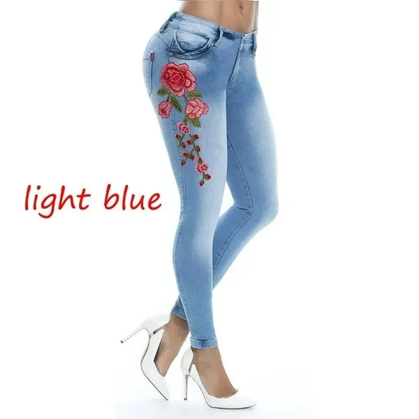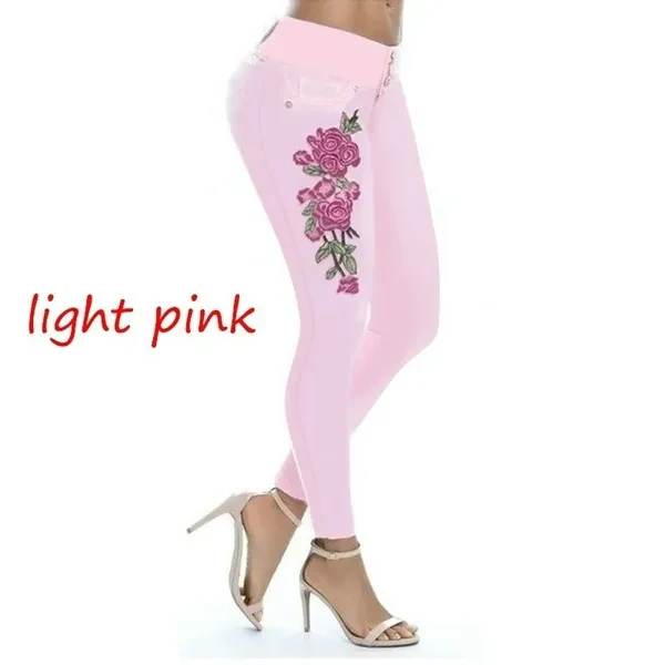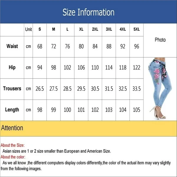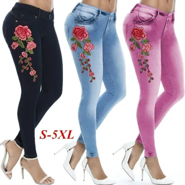 New Women's Fashion Waistband Floral Print Jeans Skinny Long Pants