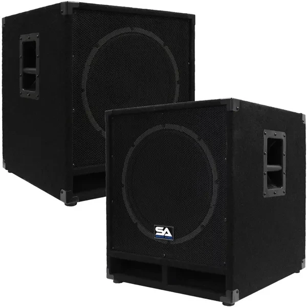 MODEL: Baby Tremor PW (Pair) CONTENTS:  Pair of Powered 15" Subwoofer Cabinet CONDITION: New APPLICATION: Subwoofer / PA Subwoofer / DJ Subwoofer ACTIVE/PASSIVE: Powered / Active WOOFER: 15" WOOFER SPECS: 70 oz Magnet and 3" Voice Coil POWER: 300 Watts RMS; 600 Watts Peak FREQUENCY RESPONSE: 35 Hz - 800 Hz SENSITIVITY: 98 dB SPL: 108 dB - Continuous LPF (LOW PASS FILTER): 40 Hz - 300 Hz CONNECTORS: Two Line Input/Output - XLR Combo / Male XLR NOMINAL IMPEDANCE: 8 Ohms PORTS: Yes GRILL: Full Metal Grill HANDLES: Recessed Metal COVERING: Black Carpet with Black Metal Corners ENCLOSURE: 5/8" Plywood Construction POLE MOUNT: Yes HEIGHT: 23.25" WIDTH:  20.75" DEPTH: 19.75" WEIGHT: 73 lbs per Cabinet WARRANTY: One Year Warranty SPECIAL FEATURES:  Can be Daisy Chained SPECIAL FEATURES: 3 Channel Amplifier Built In AMPLIFIER TYPE: Class AB POWER SELECT:  110V-120V or 22V-240V Power Supply SPECIAL FEATURES: Two Channel Satellite Power Output - 8 Ohm - 2 x 150 Watts SPECIAL FEATURES: Balance, Clip Indicator Light, Power Indicator Light SPECIAL FEATURES : Separate Sub and Satellite Volume - Switch for 200 Hz High Pass Filter
