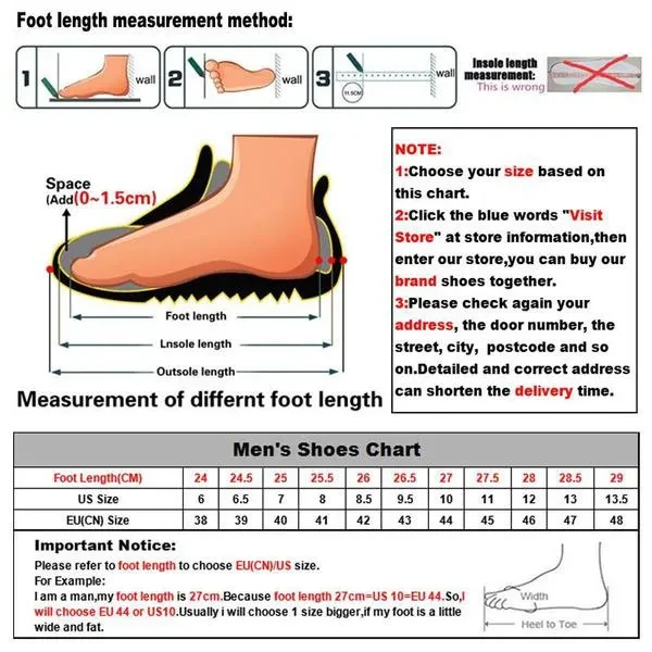 size: Please note. Simple packaging, in order to better protect the shoe CN/EU 38= US 6= Foot Length 240mm CN/EU 39= US 6.5= Foot Length 245mm CN/EU 40= US 7= Foot Length 250mm CN/EU 41= US 8= Foot Length 255mm CN/EU 42= US 8.5= Foot Length 260mm CN/EU 43= US 9.5= Foot Length 265mm CN/EU 44= US 10= Foot Length 270mm CN/EU 45= US 11= Foot Length 275mm CN/EU 46= US 12= Foot Length 280mm CN/EU 47= US 13= Foot Length 285mm CN/EU 48= US 14= Foot Length 290mm Size:38,39,40,41,42,43,44,45,46,47,48 Why buy from us?  Worldwide fast shipping! Free tracking number! Quickly and satisfying communication! Unique high-quality goods! Best prices! Please reference our size picture carefully! Measured by hands, please allow 1-3mm error! Due to computer monitor, may exist some color error, please do not mind!