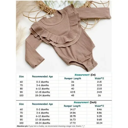 WELCOME - Quality is the first with best service. customers all are our friends. - Fashion design,100% Brand New,high quality! - Material: 100% Cotton - Color: As shown in the pictures - Listing Includes: A Ruffle Romper - Sizes: 60/70/80/90/100Cm Size Chart: Attention plz: If your kid is chubby, we recommend choosing a larger size, thanks. Size Recommended Age Measurement (Cm) Romper Length Waist*2 60 0-3 Months 36 21.5 70 3-6 Months 38 22.5 80 6-12 Months 40 23.5 90 12-18 Months 42.5 24.5 100 18-24 Months 45 26   Size Recommended Age Measurement (Inch) Romper Length Waist*2 60 0-3 Months 14.17 8.46 70 3-6 Months 14.96 8.86 80 6-12 Months 15.75 9.25 90 12-18 Months 16.73 9.65 100 18-24 Months 17.72 10.24 Attention plz: If your kid is chubby, we recommend choosing a larger size, thanks. ^_^ There is 2-3% difference according to manual measurement. please check the measurement chart carefully before you buy the item. 1 inch = 2.54 cm Please note that slight color difference should be acceptable due to the light and screen. What You Got: 1 x Sweet Romper