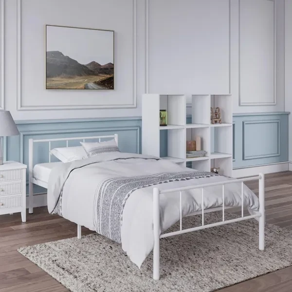 Give your toddler a bed to aspire to. With the Rack Furniture Steel Twin Sized Bed, you'll have them sleeping on their own in no time. With a sleek, simple design, the Austin Metal Twin Bed is the natural next step for your child as they transition out of the crib or toddler bed. The solid steel construction provides years of use, with six points of contact, delivering reliable support whether your child is sleeping or playing. With a non-toxic finish, this bed frame wipes clean easily, making this the ideal fit for the terrible twos. Included in this bed frame set are a headboard, footboard, and full metal slat mattress support. Integrating a box spring and bunkie board is not required and a mattress is not included. This classic twin bed assembles quickly and easily with all necessary parts and tools included. This bed measures 79.53 inches long, 39.49 inches wide, and 30.39 inches tall. Let your child sleep in style and makeup bedtime exciting with the Rack Furniture Steel Twin Sized Bed