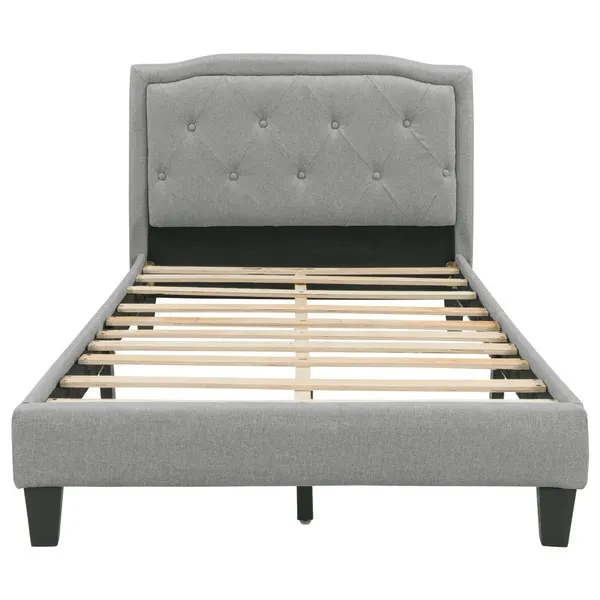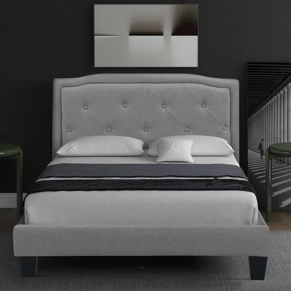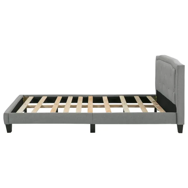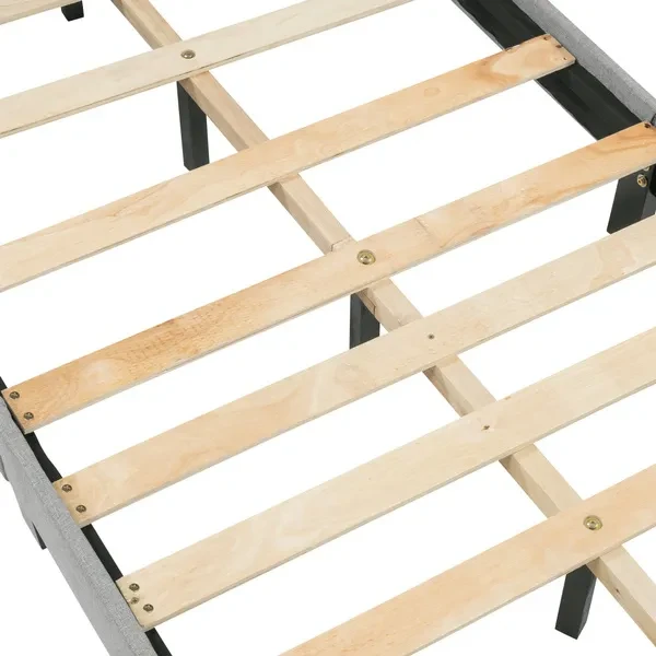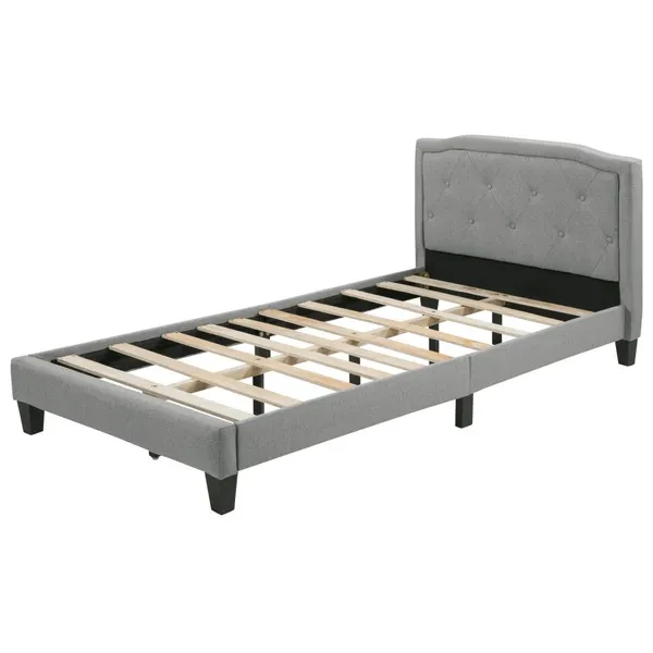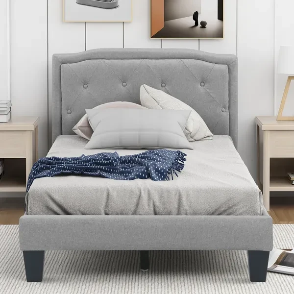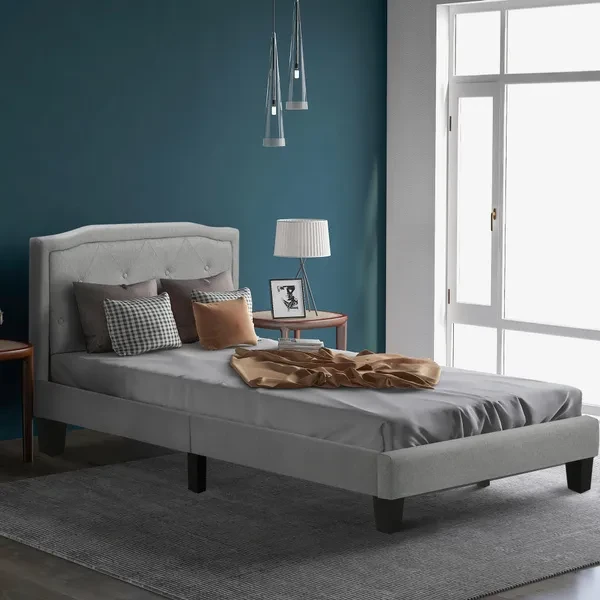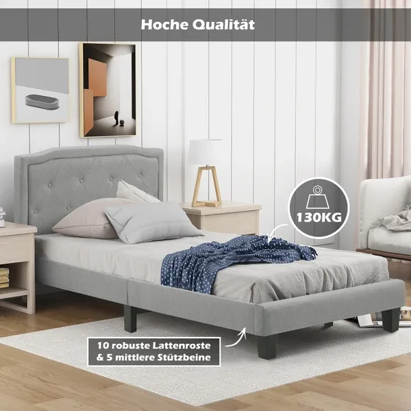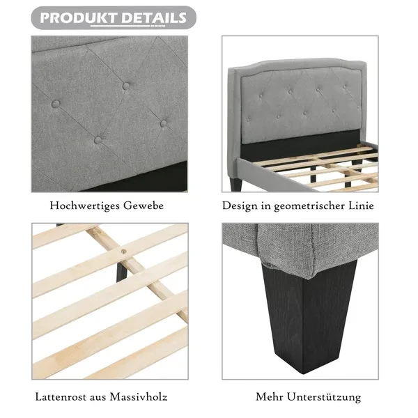 DIMENSIONS OF PRODUCT DETAILS Headboard height : 88 cm Applicable mattress: 90 x 200 cm (mattress not included) Foot part height: 24 cm Cover material: linen Ground clearance: 11 cm Color: light gray Net / gross weight 26/28 kg Slatted frame quantity: 10 Overall dimensions: 222.5 x 105 x 88 cm (L x W x H) Max. Weight capacity: 130 kg Package dimensions (cm): 106 x 68 x 14 cm (L x W x H) Assembly method: Install yourself properties Attractive design The bed frame presents itself with the beautiful decorative buttons in the headboard, which gives the bed a vintage style. Cover in light gray linen makes it go with all bed linen. Bed legs in wood look fit perfectly into the existing furniture. Its all-match appearance feature means you don't have to worry about purchasing it. Supervisor companion Bed slats are stable and durable, 5 inner support legs and 2 middle legs on the sides provide more stability and security. Don't feel unstable and shaky when you sleep. 88 cm high headboard with soft linen offers your back comfortable support when you read on it or watch TV. Under-bed storage The 11 cm ground clearance creates extensive storage space for laundry, clothes, children's toys or other items. This bed is functional, the practical storage space can keep your bedroom tidy and you are no longer tormented by the clutter. High quality Natural linen is skin-friendly, the bed slats are made of solid wood and the inner support legs ensure durability. It has a maximum load capacity of 130 kg and can not only distribute the body weight evenly, but also optimally protect the mattress from deformation. easy installation A good selection with an ideal price-performance ratio for your family. Construction instructions and necessary tools are included in the scope of delivery. The installation is best done by two people. In less than forty minutes you can quickly enjoy the comfort of this bed. Mattress is not included. 5 high points Quilted seams with the buttons on the headboard give the bed a classic baroque touch. Linen upholstery in a neutral color is all-match, it fits your existing furniture without any problems. 11 cm from the floor creates storage space for storing clothes, bed linen, etc. Robust slatted frame and legs ensure a deep and restful sleep. Easy installation, ideal bed frame for people of different ages. Lying surface with dimensions of 90 x 200 cm