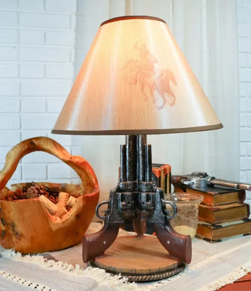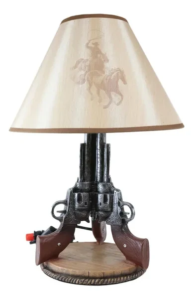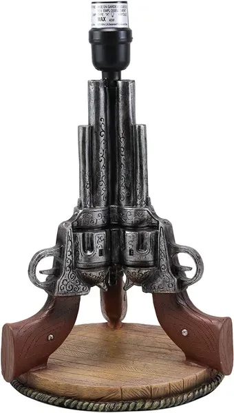 • This Western Triple Six Shooters Revolver Gun Table Lamp comes with the fabric shade as pictured. Made of polyresin, hand painted and polished, the quality finish is superb! • This overall Western Triple Six Shooters Revolver Gun Table Lamp measures about 20" tall. The shade is 8" tall and 13" in widest diameter. Fully assembled, the lamp weighs slightly over 4 lbs. • The 3 revolvers lamp body measures 14.5" tall and 9" in wide and 8.25" deep approximately. Because all our products are individually hand painted work of art, the color tone may vary from the pictures. Use only Type A light bulb (not included), Max 40 watt. Approx. 4 1/2 ft. UL Approved electric cord with a rocker on/off switch. • This western decoration is always a sensation for cowboys or lovers of the wild west. This decorative desktop or table lamp adds a well lit frontier touch to any room decorated with Western or Southwest themed home accents. Featuring well detailed 3 revolver guns pointing up toward the sky supported by a round faux wood plank base. This lamp will illuminate your room with Western Charm! • This is an Ebros exclusive collection. Accessories and Decor pieces in pictures are not included with the listing; only the shade and the revolver lamp base is sold in the this listing.