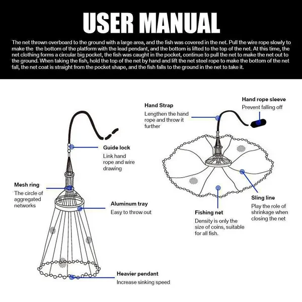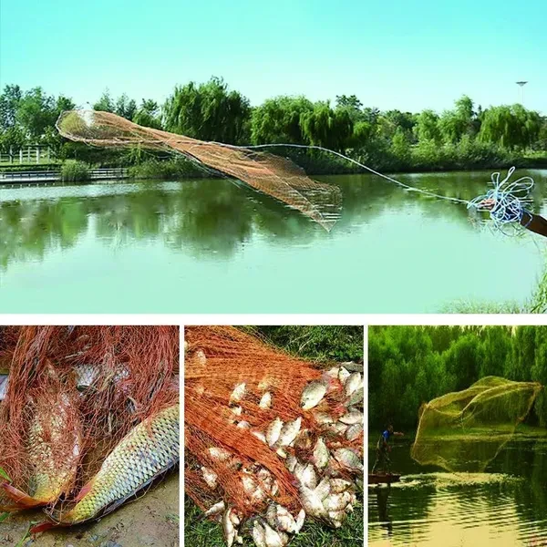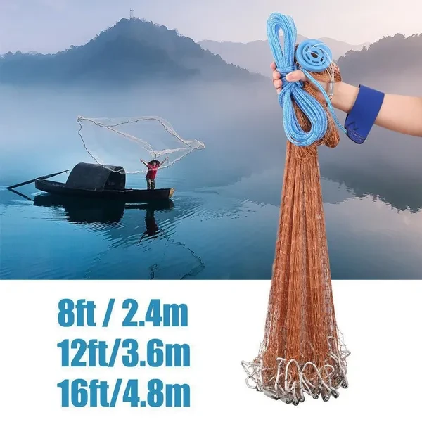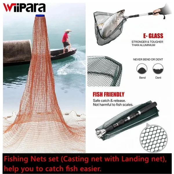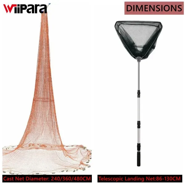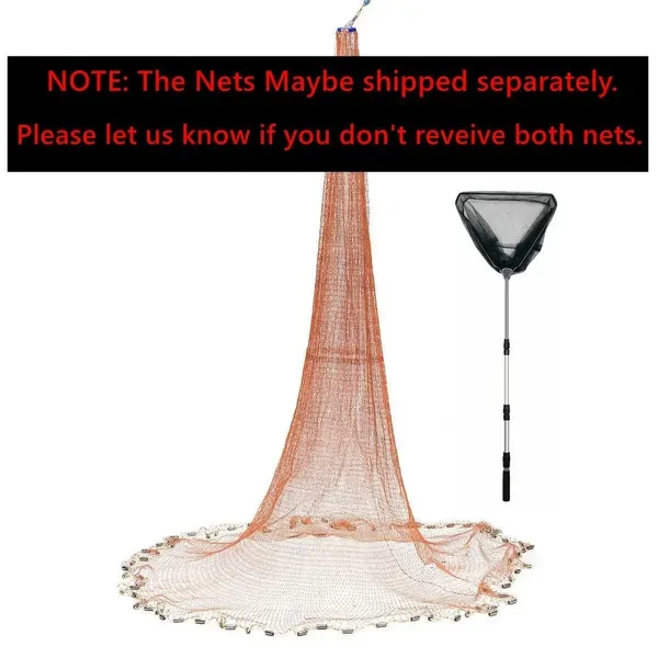 WIIPARA Fishing Nets Set included a Cast Net and a Landing Net Features and Benefits: ● Strong and durable material ● Upgrade the tire line hand throwing the net ● Nylon fishing net with sinkers, strong and easy to use. ● Forget about drawstring tangles: using this net will be much faster and easier than ever! ● Better spread due to uniform weight distribution - easier to cast ● The continuous weight line has a better seal on the bottom and allows the net to sink evenly ● Advanced assembly technique and high level of quality control leave little room for defects. ● Retaining the original fishing nets of the net pocket, you can cope with larger fish, mesh control can prevent small fish escape. ● There is a large throwing area, very suitable for fish ponds and field use. ● An essential fishing equipment for fishermen, help you get more fish. Specifications: Type: Cast Net Color: brown Material: Strong Nylon Diameter: 2.4M/3.6M/4.8M (8ft/12ft/16ft) Weight about: 1600g, 2000g, 2400g Cadt Hole size: 1.5cm Position: Sea, Lake, Pond, River, Stream fishing, etc Notice: 1. Please allow 1-3cm error due to manual measurement.Pls make sure you do not mind before you bid. 2. The color may have different as the difference display,pls understand. Package Included: 1x Cast Net 1x Landing Net