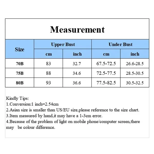 Features Color: as picture Size: 70B,75B,80B Material: Nylon Package Content: 1SET Kindly Tip: 1. Conversion: 1 inch= 2.54cm Size Approximately : These size is about Asian Size,general get one size smaller than US/EU size,Please reference to the size chart in the picture. Item Measure by hand, it could be 1-3cm different. hope you can understanding, will be sincerely appreciated. 2 .Please be reminded that due lighting effects, monitor's brightness/ contrast settings etc, there could be some slight differences in the color tone of the website's photo and the actual item.