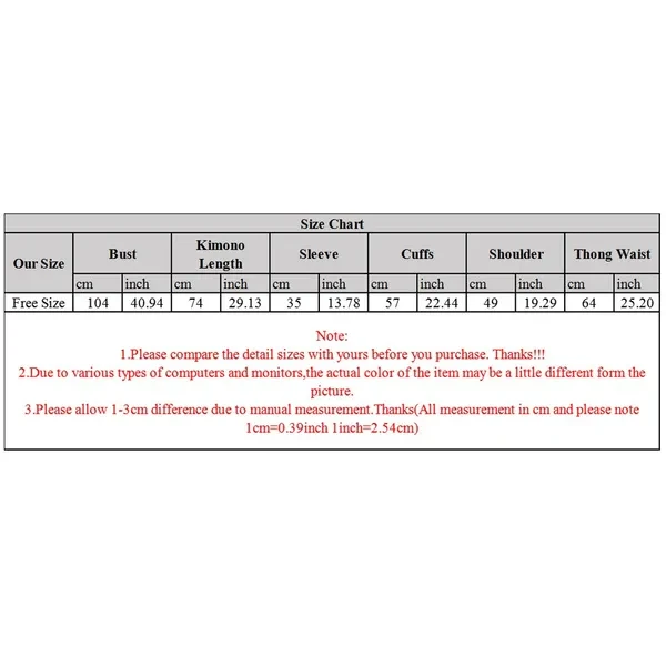 Description: Features: 100% brand new and high quality Made of high quality polyester, silky smooth, soft and lightweight, comfortable flowy, pretty and flattering. Open front, oblique V-neck robe, 3/4 sleeve, pink cherry and cat printed, short style, above knee length. Delicate classic bowknot waistband, the three-dimensional big bow is cute and can show the beauty of the waist, stays closed well. Lovely Japanese style and flirting color, charming and seductive. Suitable for valentine, bridesmaid, cosplay, wedding, etc. 1 kimono&waistband&g-string only, other accessories demo in the picture are not included! Specification: Color: Pink Material: Polyester Size:One Size Bust:104cm(40.94inch) Kimono Length:74cm(29.13inch) Sleeve:35cm(13.77inch) Cuffs:57cm(22.44inch) Shoulder:49cm(19.29inch) Thong Waist:64cm(25.19inch) Quantity: 1 set Warm prompt: 1.Asian people size is 1 or 2 sizes smaller than European and American. 2.Please note that low temperature washed,do not bleach and place under the blazing sun for quite a long time. 3.As different measuring methods,it will occur 1-3 cm deviation about the items,please ensure that it is okay for you before ordering. 4.Because of different monitors and lamplight,the picture may not reflect the actual color of the item,really thank you for your kind understanding! Package includes: 1 x Kimono Robe 1 x Waistband 1 x G-string(without retail package)