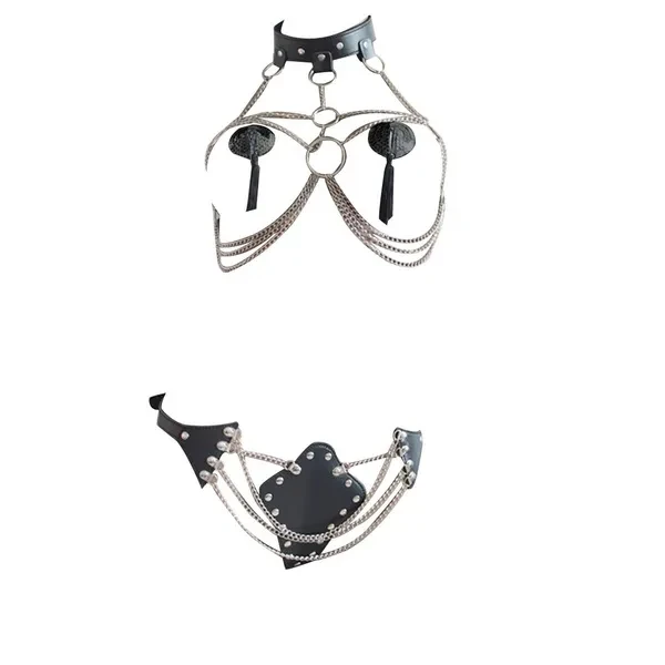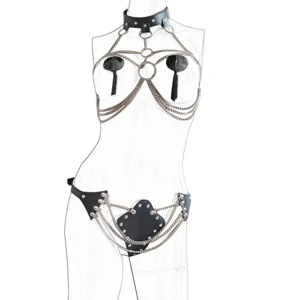 Set Include: 1pc top, 1pc G-string, 1 pair pasties Condition: New without tag Material: PU Leather, Chain Color: (As pictures shown) Features: Womans body harness, snapped collar connected to chains bikini top. One size, fits max neck circumference 40cm, chest 74-94cm. The thong has adjustable straps with buckles, fits waist 74-94cm. Friendly Tips: The size is measured by hands, please allow minor error of measurement. Photo color might be a little different from the actual product due to color display of different monitors.