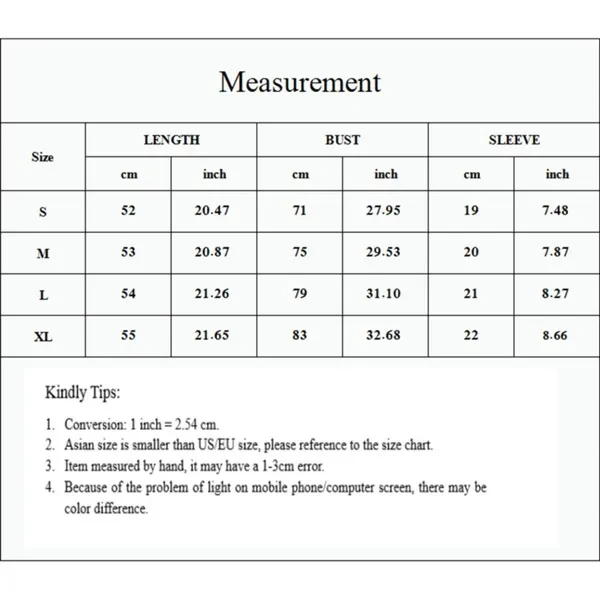 Features Color: Black,Pink,Fuchsia,Navy,Light Blue Size: S:Garment length is about 52cm, sleeve length is about 19cm, bust is about 71cm, error is about 3cm M:Garment length is about 53cm, sleeve length is about 20cm, bust is about 75cm, error is about 3cm L:Garment length is about 54cm, sleeve length is about 21cm, bust is about 79cm, error is about 3cm XL:Garment length is about 55cm, sleeve length is about 22cm, bust is about 83cm, error is about 3cm Material: Polyester fiber (polyester) Package Content: 1 PC Kindly Tip: 1. Conversion: 1 inch= 2.54cm Size Approximately : These size is about Asian Size,general get one size smaller than US/EU size,Please reference to the size chart in the picture. Item Measure by hand, it could be 1-3cm different. hope you can understanding, will be sincerely appreciated. 2 .Please be reminded that due lighting effects, monitor's brightness/ contrast settings etc, there could be some slight differences in the color tone of the website's photo and the actual item.