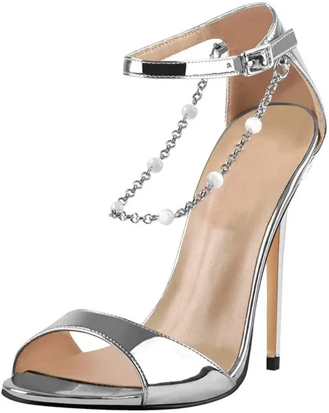 Womens Beaded Chain Ankle Strappy Stilettos High Heel Sandals Open Toe Single Band Pearl Sandals Shoes