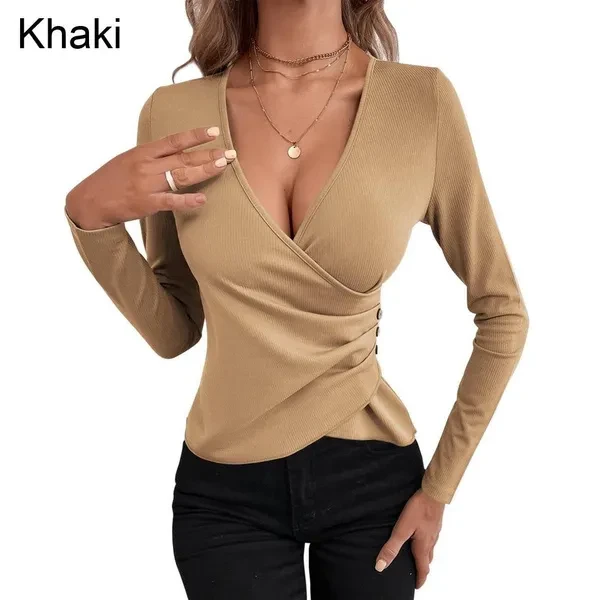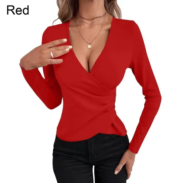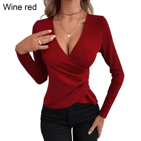 Women's Sexy Deep V Neck Long Sleeve Tops Ladies Low Cut Irregular Pleated T-shirt Fashion Slim Fit Tops