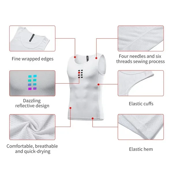 WOSAWE Men's Cycling Summer Lightweight Breathable Undershirt Vest Product Features: Mesh breathable fabric Collar and cuffs wrapped Moisture wicking and quick drying Stretch design for a comfortable fit Eight reflective squares on the chest for safe riding at night Package included: 1 x Cycling Sleeveless Undershirt Specification: Name: Cycling sleeveless undershirt Colour: White Gender: Men Material: Polyester Size: S, M, L, XL, 2XL, 3XL Weight:(XL) About 97G/0.21LB Applications: Cycling, Running, Hiking, Motorbike, Mountaineering and other outdoor sports