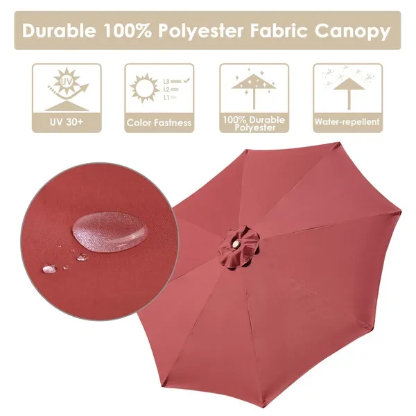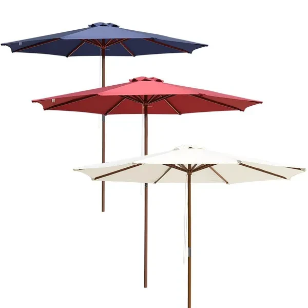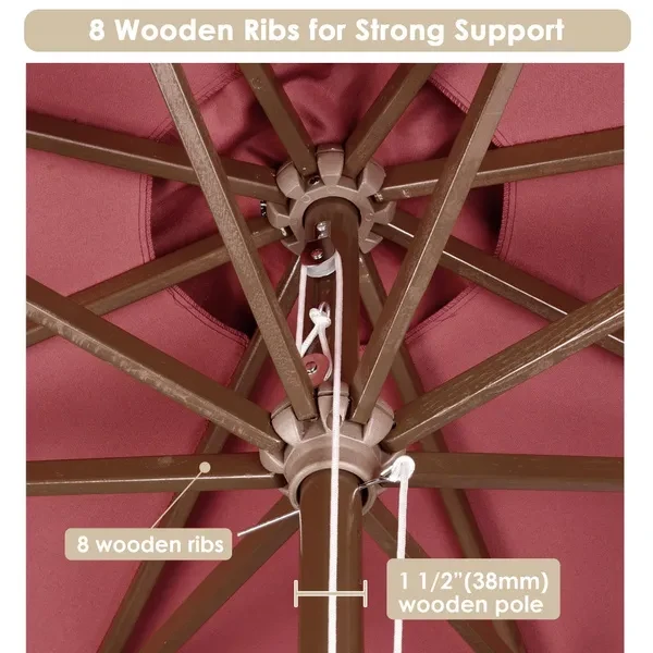 Features: - This 9ft 8 ribs retro wooden frame patio umbrella is classic and never out of date, which provides not only shade but special scenery for your patio, garden, deck, backyard, pool - Durable 180g polyester fabric cover: - UV30+ Protection - Effectively protect you from being harmed under sunlight, can be also used when drizzling - Fade Resistant - Color fastness up to European Standard level 3, keeps original color under sun exposure longer than those without any anti-fade technology - Easy Storage - A free strap included to bind umbrella canopy for convenient storage Specifications: - Overall Dimension(LxWxH): 108" x 108" x 95 11/16" (274.32 x 274.32 x 243 cm) - Umbrella Canopy Dimension(LxW): 108" x 108" (274.32 x 274.32 cm) - Pole Dia.: 1 1/2" (38 mm) - Bare Umbrella Pole Length After Closing: 41 5/8"(106cm) - Rib Quantity: 8 - Color: White / Terra Package Contents: - 1x Patio Umbrella - 1x Pole - 1x Strap - 1x Manual