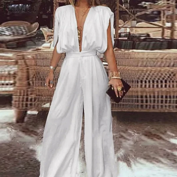 ZANZEA Women V Neck Solid Sleeveless Party Long Jumpsuit Wide Leg Lace-Up Summer Romper Pants